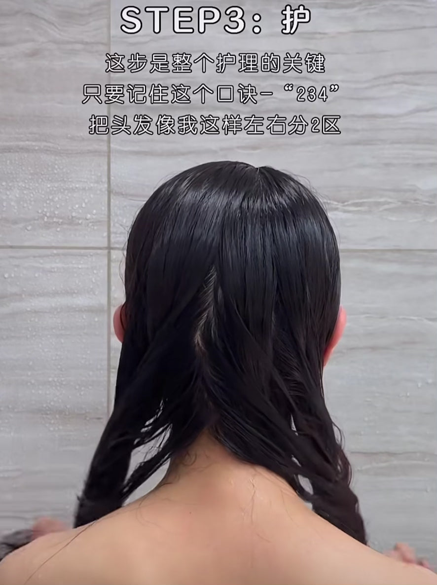 先將頭髮分2區,然後取適量髮膜,順3下頭髮,然後轉4圈,敷個 5分鐘,然後用水沖洗。